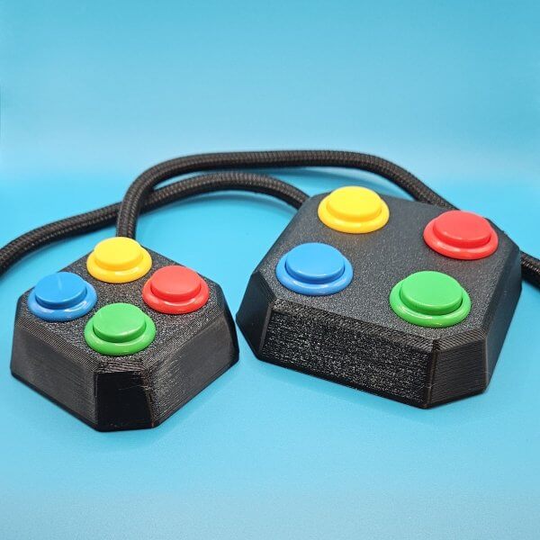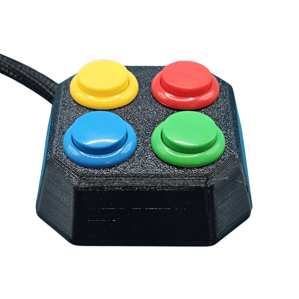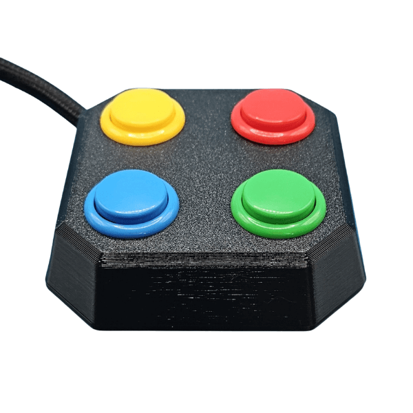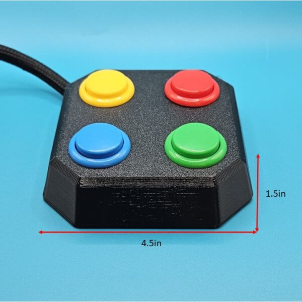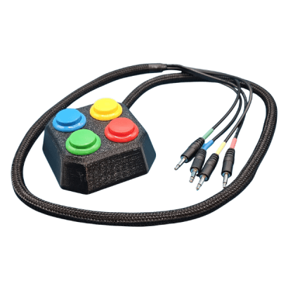 QuadPad Adaptive Button Set designed for individuals using adaptive gaming setups who need familiar, intuitive button layouts. Features four arcade-style buttons colored and arranged to mirror the ABXY layout found on Xbox controllers. Connects via 3.5 mm headphone jacks and is compatible with any port on the Xbox Adaptive Controller (XAC) and PlayStation Access Controller (PAC). Available in Small (24 mm) or Large (30 mm) button sizes.